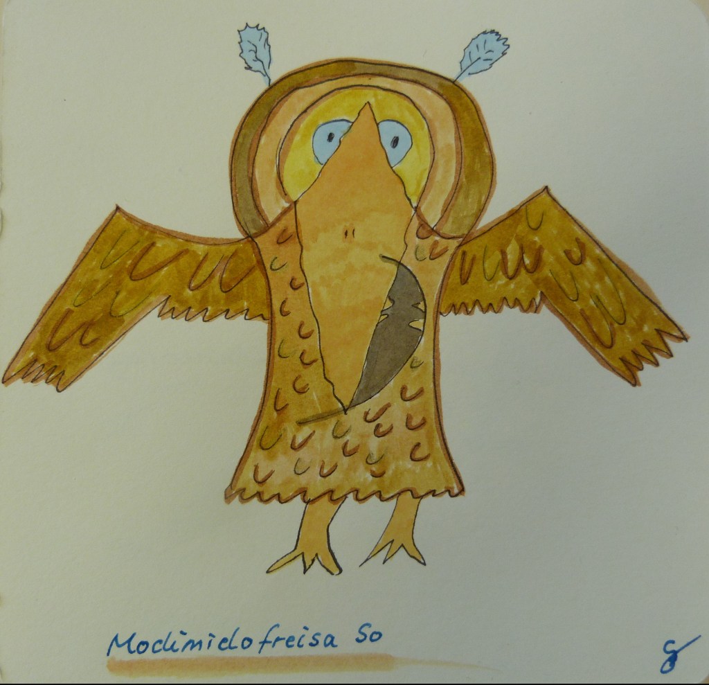 Der Hüter der Wochentage. Er wacht über jeden Tag, versucht immer wieder deutlich zu machen, dass manche ganz bestimmt rumgehen und andere in Erinnerung bleiben, auch wenn sie gehen. Er hüllt manches mit seinen Federn ein um es vergessen scheinen zu lassen und mit seinen feinen Federantennen sorgt er für Intensität mancher Momente. Ihn muss jeder Betrachter mit seinem Fühlen betrachten und füllen. Er wartet auf jeden von uns geduldig. Dramata Turgi betrachtet ihn stets mit einem liebevollen Lächeln, er ist ihr nicht die näheste Figur und doch am nähesten.