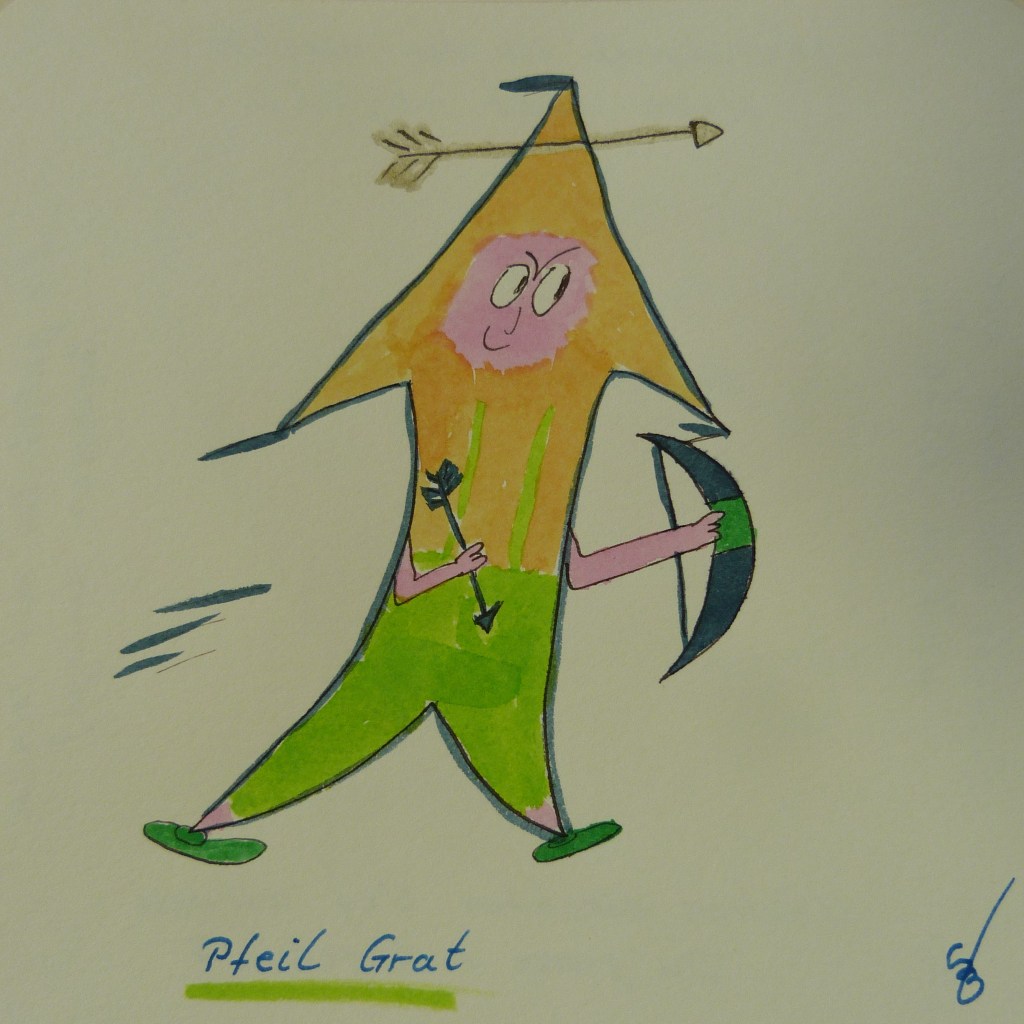 Manchmal ist der direkte Weg der um die Ecke und wenn es pfeilgrad besser ist, dann ist es oft auch eine Wanderung auf einem Grat. Wie nehmen es die Menschen auf, wenn man seine Gefühle in Worte kleidet und ist man zu sich ehrlich, ist man pfeilgrad mit dem, was man sich eingesteht? Oder ist es eine Wanderung auf dem Grat des Glücks oder der Unzufriedenheit. Das Ziel vor Augen haben heißt auch mal einen Umweg mit Überzeugung zu gehen und mit Mut scheinbar direkt zu gehende Wege auszulassen, weil man dafür seine Überzeugung verlassen müsste. Ein direktes Wort kann auch mitten ins Herz treffen. Schambolzen bewundert Pfeil Grat und Moralin von Sauer ist immer wieder sprachlos, was Fverdi Wirr äußerst erheiternd findet.
