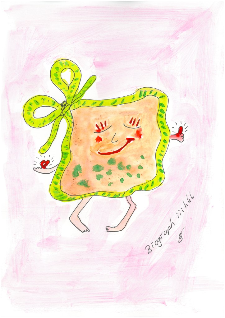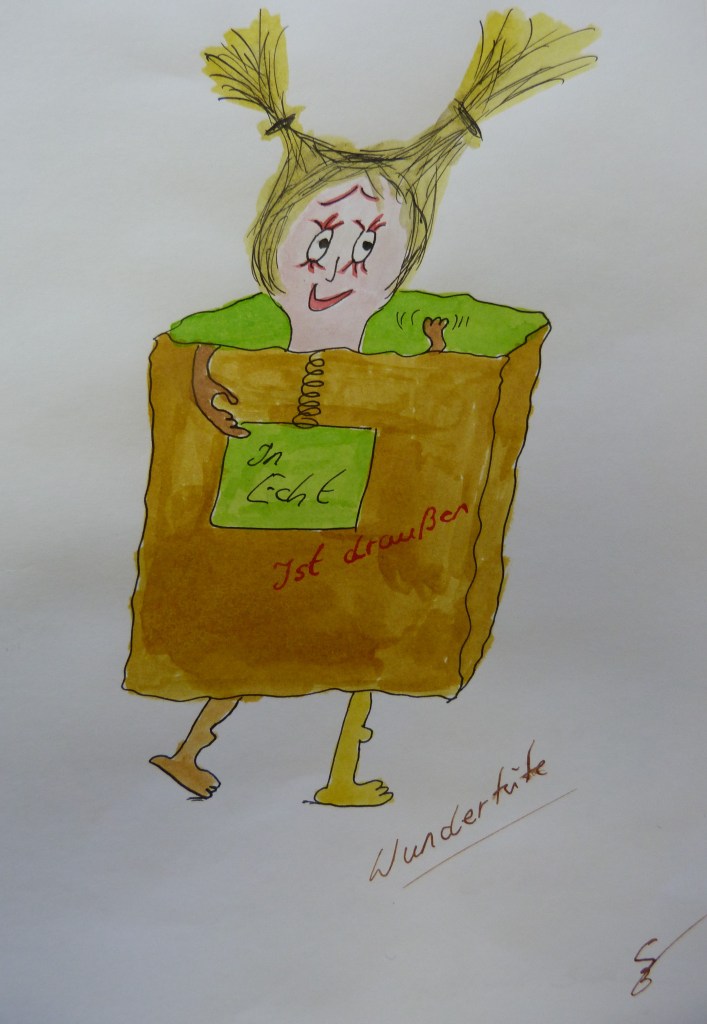 Die erste der beiden „Pandemie-Figuren“ beschreibt, das in einem viel steckt, was man nur „in echt“ sehen kann, also bei einer realen Begegnung. Ob es Stärken oder Schwächen sind, Fähigkeiten oder all das, was man nicht so wirklich gut beherrscht. Sie ist jene, die gerne Sätze verdreht. Dann ist draußen drinnen, weil draußen auf einmal das ist, was bisher drin unentdeckt vor sich hinschlummerte. Jetzt wird es aufgeweckt und Fähigkeiten und Stärken, die bisher ungenutzt, weil ungebraucht waren, finden ihren Weg aus der Wundertüte ins Leben…wenn der Wundertütenbesitzer den Mut dazu hat. Resilienzia ist gern an ihrer Seite, genauso scharfe Schicht, die immer mal wieder schaut, ob sie eine neue Schicht findet.