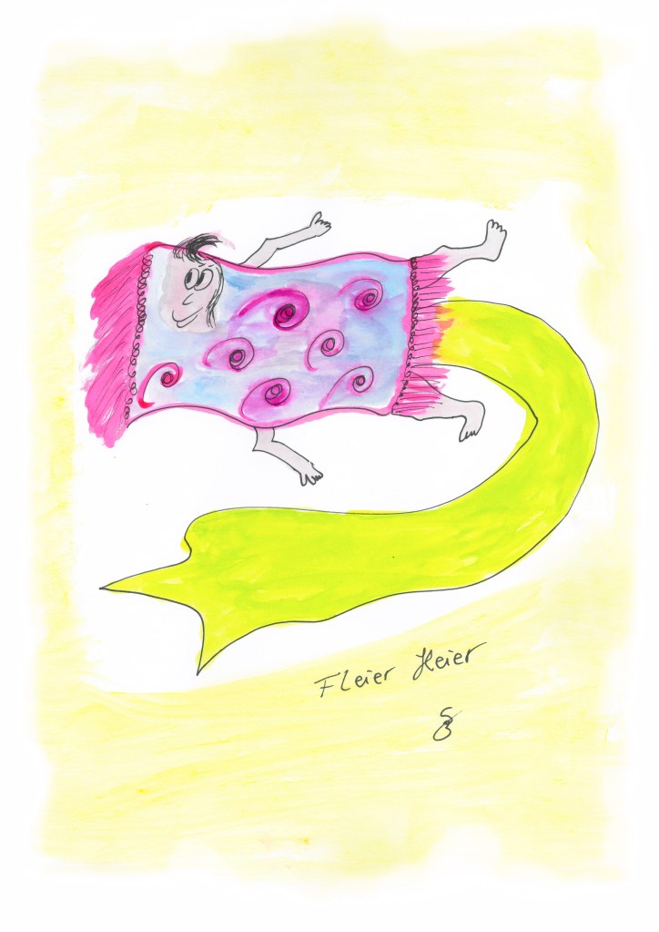 Fleier Heier ist der Nachrichtendienst der Dramataturgis. Er verbreitete Nachrichten, sammelt Geschichten und ist ein bisschen eine dramataturgische Enzyklopädie. Er fliegt leidenschaftlich gerne durch alle Gedanken und Gefühle, sammelt und schreibt alles auf sein an den Teppich geknüpftes Plakat.