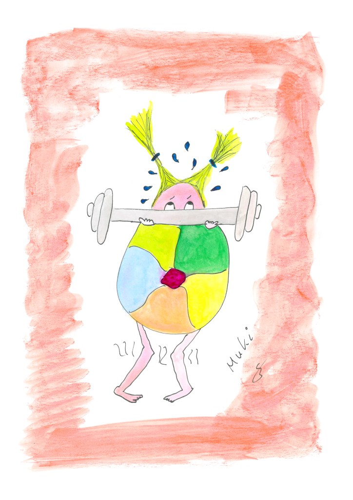 Sinnbild für den inneren Schweinehund, den es zu überwinden gilt, wenn es um Aufgaben geht. Die müssen nicht körperlicher Natur sein! Sie betreffen auch seelische und geistige Prozesse, aber bis man sich auf macht…ist Muki zugange und versucht die Balance zu halten oder zu zeigen, dass da etwas ist, was zu tun ist. Muki schwitzt gelegentlich sehr, wenn die Selbstsorge „dahin“ geht.