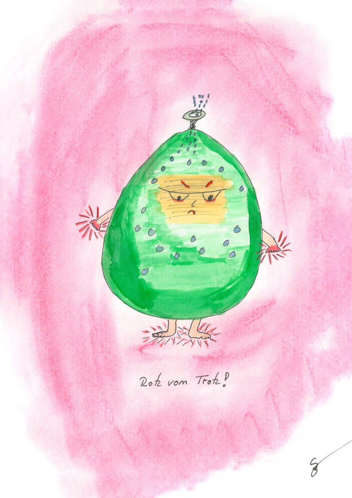 Trotzig, bockig, in der Wortwahl rotzig, so erwartet man diese Figur. Im Grunde stimmt das auch, aber der Grund ist das entscheidende. Rotz vom Trotz ist vor allem verzweifelt, weil ihn Gefühle einsperren, erstarren lassen. Gefühle machen ihn unfähig zu kommunizieren und sein einziger Ausdruck ist dann Trotz oder bockiges Verhalten. Zum Glück kann so manche Verzweiflungsblase oben entweichen, sonst würde er früher oder später platzen. Nerv Zwärch ist immer etwas erheitert und Mo Brööö fühlt sich von ihm bedroht. A2-DL-2 hilft ihm immer mal raus aus der Starre und Scham Bolzen rennt vor ihm davon, bringt er sie alle doch immer in die Gefahr sich schämen zu müssen.