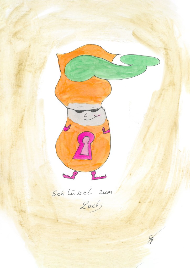 Irgendwie braucht jeder immer mal einen Schlüssel zu einem Loch in dem er/sie/aeb[1] steckt. Schlüssel zum Loch ist da sehr optimistisch, jeder hat mindestens ein Loch, meist kommen immer mal welche und Schlüssel geht davon aus, dass auch das Wesen, welches den Schlüssel hat stets mitkommt. Schlüssel fordert uns also auf die Augen aufzumachen, um im Loch nach dem Schlüssel zu suchen. Der kann auch ganz banal im eigenen Kopf sein, oder in Seele oder Herz, so dass man selbst aus dem Loch kommen kann. Allerdings ist Schlüssel ein großer Bejaher von Unterstützung, Hilfe annehmen und darum bitten, einfach weil es gut tut jemand an seiner Seite zu haben. Scham Bolzen diskutiert da sehr gerne mit Schlüssel, allerdings hat man beim Zuhören nicht das Gefühl, dass die Beiden zu einem Ergebnis kommen wollen.