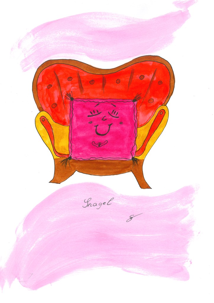 Snagel kuschelt einfach alles in Grund und Boden, was gerade bedürftig und auch nicht bedürftig ist. Kuscheln ist einfach gut für die Welt und alle Wesen. Will nun jemand nicht kuscheln, dann kuschelt Snagel einfach mit sich selbst. Völlig mit sich im Einklag bekommt Snagel wenig mit von der Welt und ist darüber auch sehr froh. Nimmt eine Dramataturgi auf ihrem Sofa Platz, umkuschelt Snagel die Figur. Manchmal sitzen Leonie Heart, Lorenz und Mo Schwammler zusammen auf dem Sofa bei Snagel…dann sieht man sie durch die Gegend schweben. Meist aber sind die Figuren nur froh, dass es das Sofa und Snagel draufgibt.